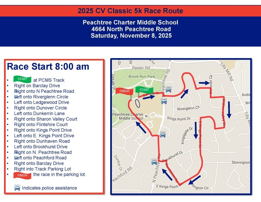 The annual Peachtree CV Classic 5K road race will be held on Saturday, November 8, 2025 at Peachtree Middle School. In addition to fundraising, Peachtree Middle School seeks to raise awareness of and promote cardiovascular (CV) health and well-being of our students, faculty, and community through the CV Classic 5K. This year marks the 16th Anniversary of the Peachtree CV Classic tradition of promoting Whole Student Wellness!