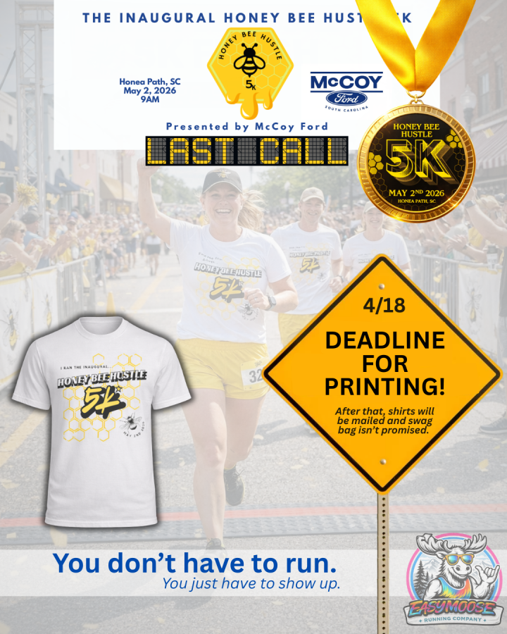 Join us for the Honey Bee Hustle 5K on Saturday, May 2, 2026, in Honea Path, South Carolina.