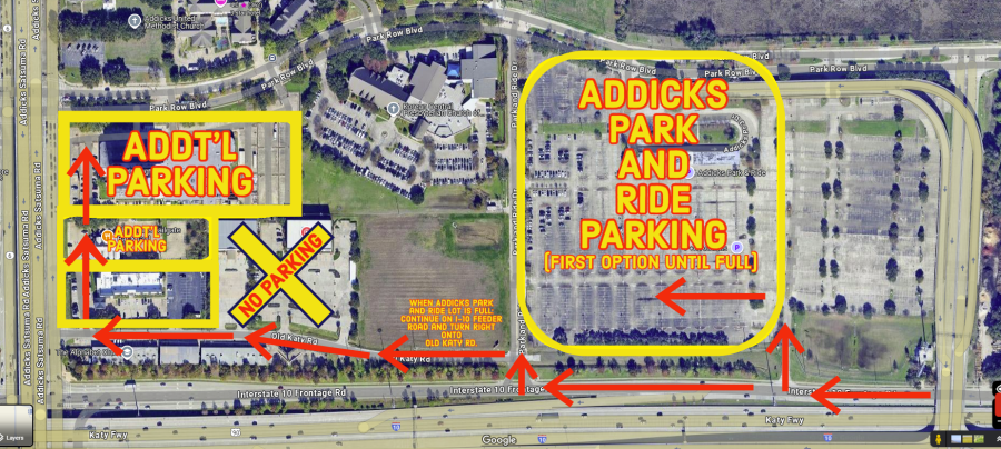 Parking The Addicks Park and Ride has a plentiful amount of accessible parking (handicap parking included) via two accessible entry/exit points on event day. See 'Course/Parking Map' below for visual details. Pay key attention to the entry/exit locations to the Addicks Park and Ride right off I-10, which has ample parking on event day. If you're planning on entering the parking lot from Park and Ride Drive, friendly reminder this street closes at approximately 8:00am and you can then only access the lot from the other entrance right off I-10 feeder road (Frontage Rd.). Excess parking is available farther down the I-10 feeder road where you turn right onto Old Katy Rd. in some of the business areas (see parking map for approved parking areas).