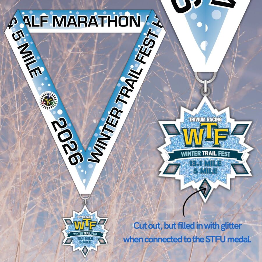 - WTF Half Marathon & 5 Mile Finisher's Medal (this medal connects to the Summer Trail Fest Ultra, Half Marathon, & 5 Mile medal, pictured below)